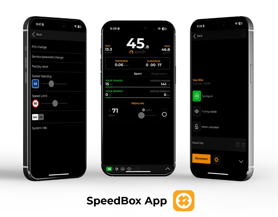 Die SpeedBox App, die speziell für die SpeedBox B.Tuning entwickelt wurde, nutzt die Bluetooth-Technologie, um Ihr E-Bike mit Ihrem Mobiltelefon zu verbinden. Nachdem Sie die App heruntergeladen und Ihr Telefon mit Ihrem E-Bike verbunden haben, können Sie die aktuellen Daten und Fahrparameter auf dem Display Ihres Telefons sehen. Sie können einzelne Fahrten speichern, mit Freunden vergleichen und Ihre eigene Leistung verfolgen. So können Sie Ihre Fahrt in vollen Zügen genießen und die Überprüfung der Parameter für später aufheben.